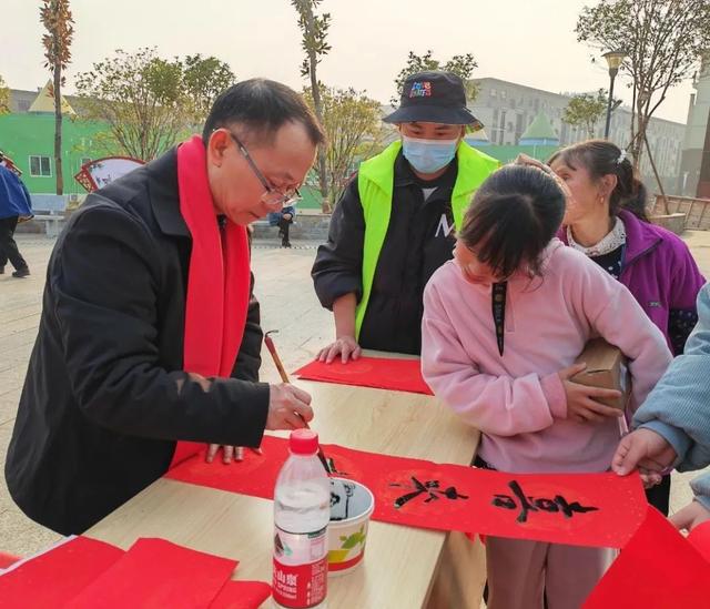 活动现场,气氛热烈,书画协会成员齐聚一堂,挥毫泼墨,写福字、书春联,将美好的新春祝愿凝于笔端。他们精心书写的一副副春联、一个个形象生动的福字吸引了不少来往群众的目光。志愿者们引导大家做好个人防护,有序排队领取春联。大家拿着一副副红红火火的春联和福字,喜笑颜开。